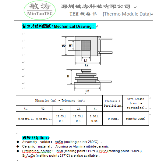 This OT series of thermoelectric modules are developed for the demands of telecom applications, AuSn Micro TEC is special for high temperature application,it is made of high performance material and advanced process technology ,typically used in optical telecommunication such as laser transceiver ,pumper laser and other high power mini laser . 此OT系列设计适用于光通讯行业,金锡微型制冷片是为高温环境下使用,它采用高性能的材料和先进的制造工艺,典型应用于光通信行业的激光发射器与大功率的小型激光器。